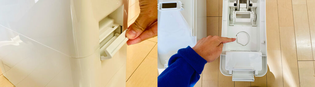 「レバー下の窪み」と「受け皿の引き出し口」を合わせて掴んで引くことで