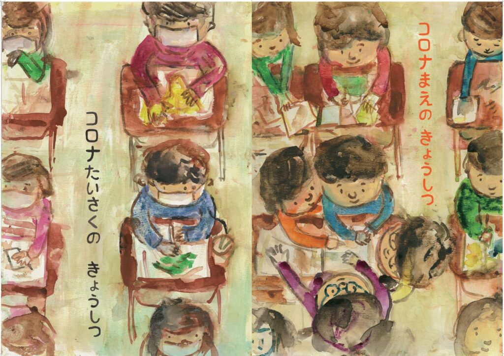 - 物語ではなく、コロナ前と後の学校の日常を並べて見せる「記録の絵本」