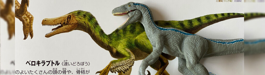 アニアやフィギュアなど恐竜のおもちゃはたくさんありますが、恐竜に興味を持ち始めた頃は「どれが本当の恐竜で、どれが作り物なのか」区別がつかないことが多くありました。たとえばベロキラプトルは、図鑑では羽が描かれているのに、映画やフィギュアでは羽がなく「どっちが正しいの?」と迷うことも。
