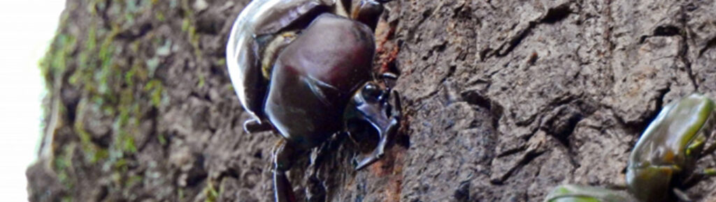クヌギやコナラだけでなく、果樹園などの実のなる木にもカブトムシ・クワガタが集まることがあります。身近な公園や雑木林を歩くときは、葉や実の様子を観察しながら「樹液が出ている木」を探してみましょう。思わぬ場所で生体に出会えるかもしれません。